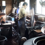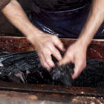 - この絣筵を、テーチギと呼ばれる車輪梅で染め上げ、泥田に入れて媒染し、これを何度も繰り返して、深い深い黒色に染め上げます。